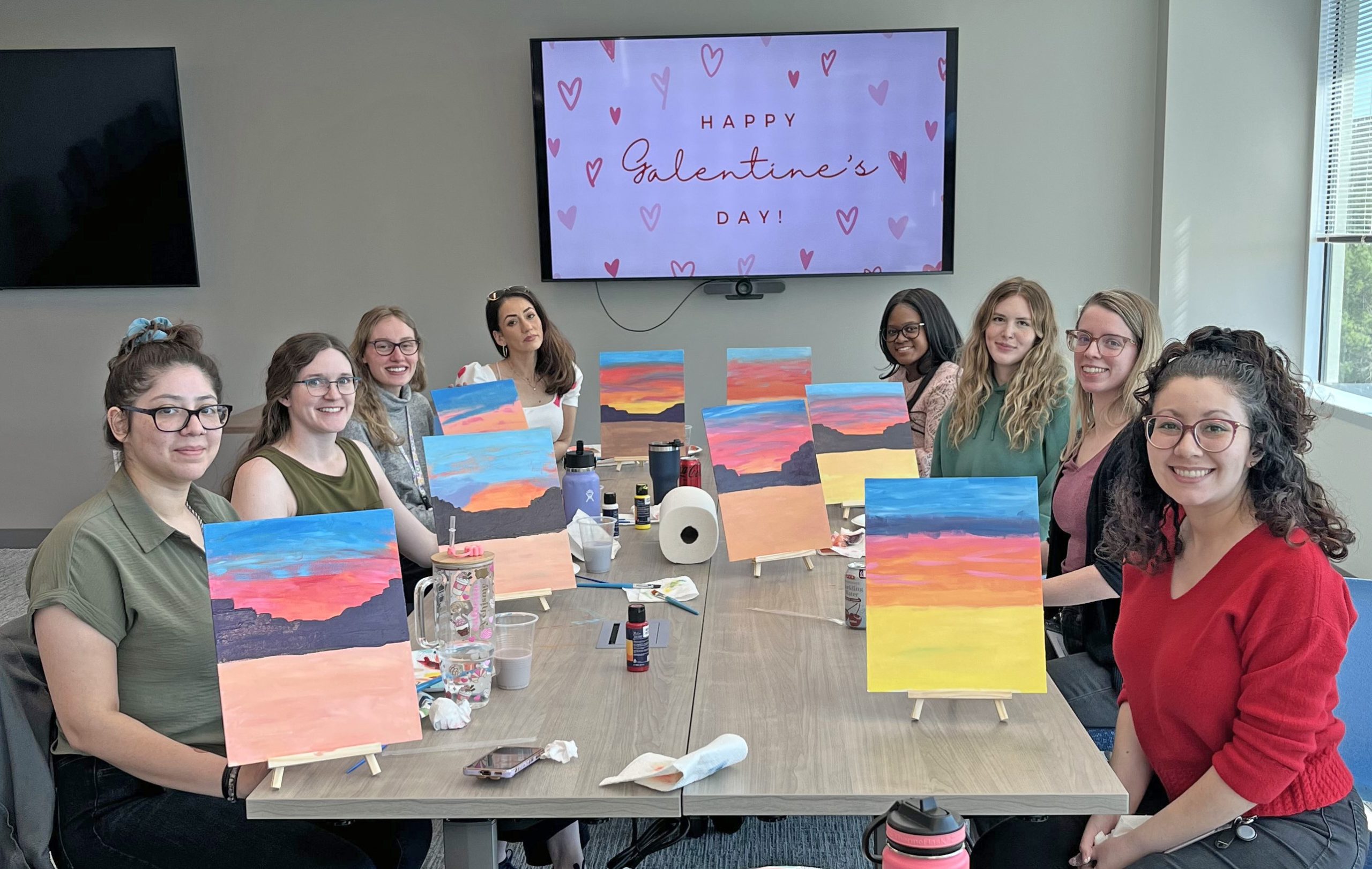 The Woodlands office celebrated Galentine’s Day with a painting activity, creating colorful sunset scenes while enjoying friendship and creativity outside the workday.